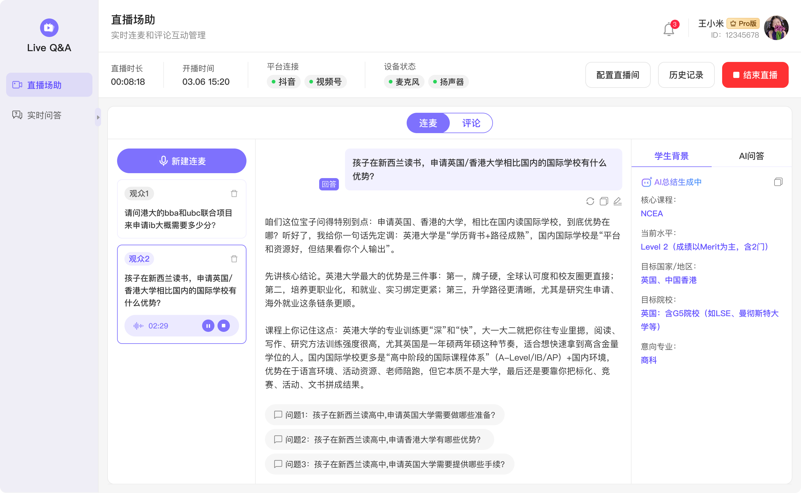 直播时最怕弹幕太快漏答,现在 Live Q&A 会实时给出回答建议,我能更快抓住重点问题,整场节奏更稳,观众停留也明显变长。